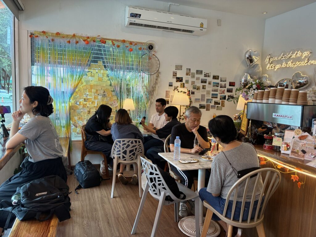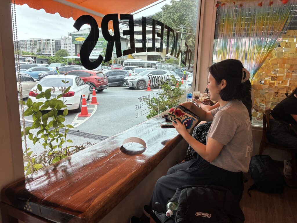 大きな窓ガラスからオートーコー市場を行き交う人を眺められて、のんびり過ごせました。