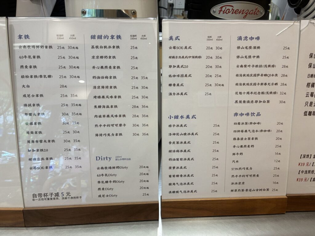 雲南コーヒーを飲んでみたかったので、2人とも雲南コーヒーラテ(25元)にしました。