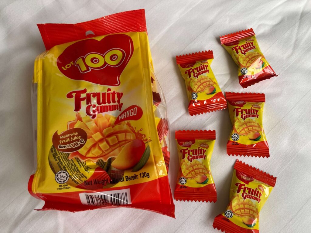 マレーシアのスーパーで買えるフルーツグミで、オレンジ、ぶどう、いちご味などがあります。