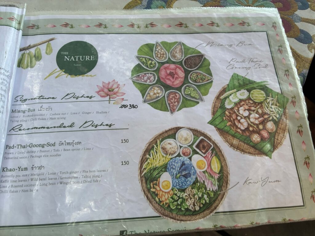 オーナーの女性がカオヤム(サラダライス) (150B)、ミヤンブア(バイ・チャップルーという葉っぱに具材をのせて甘いタレをかけて食べる前菜) (380B)をオススメしてくれました。