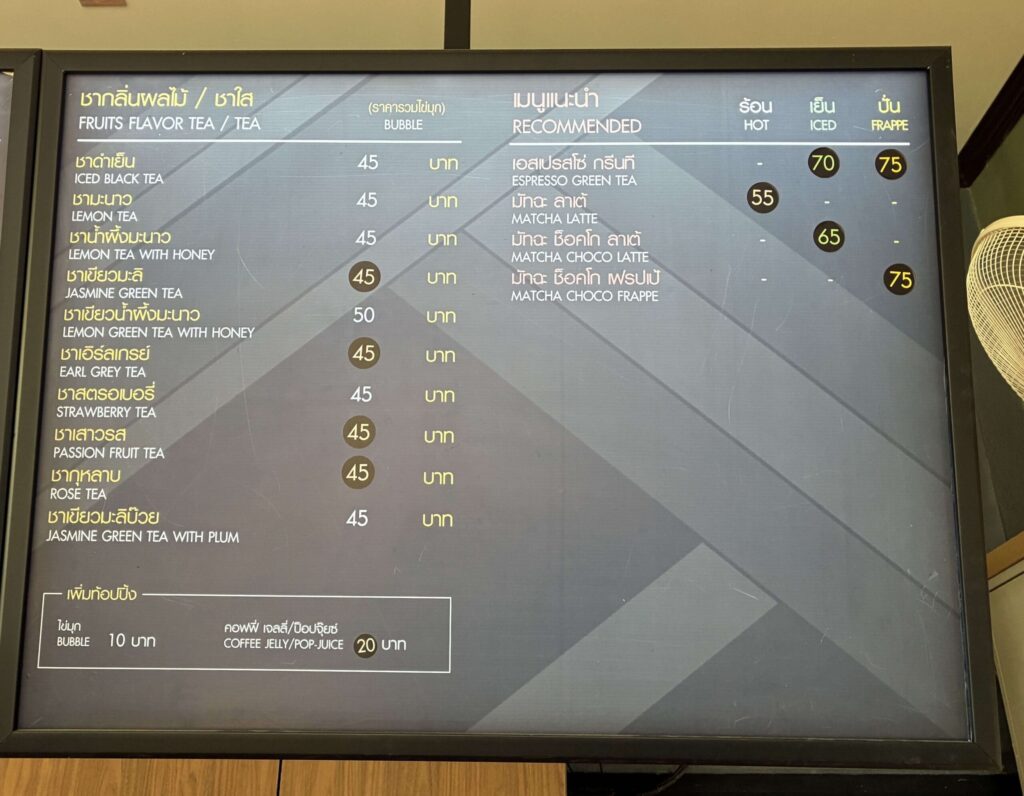 タイ人に人気の抹茶メニューはもちろん、タイティーも楽しめます。(アイスタイティー(65B))(濃い茶葉から煮出した紅茶にコンデンスミルクを加えたもの)